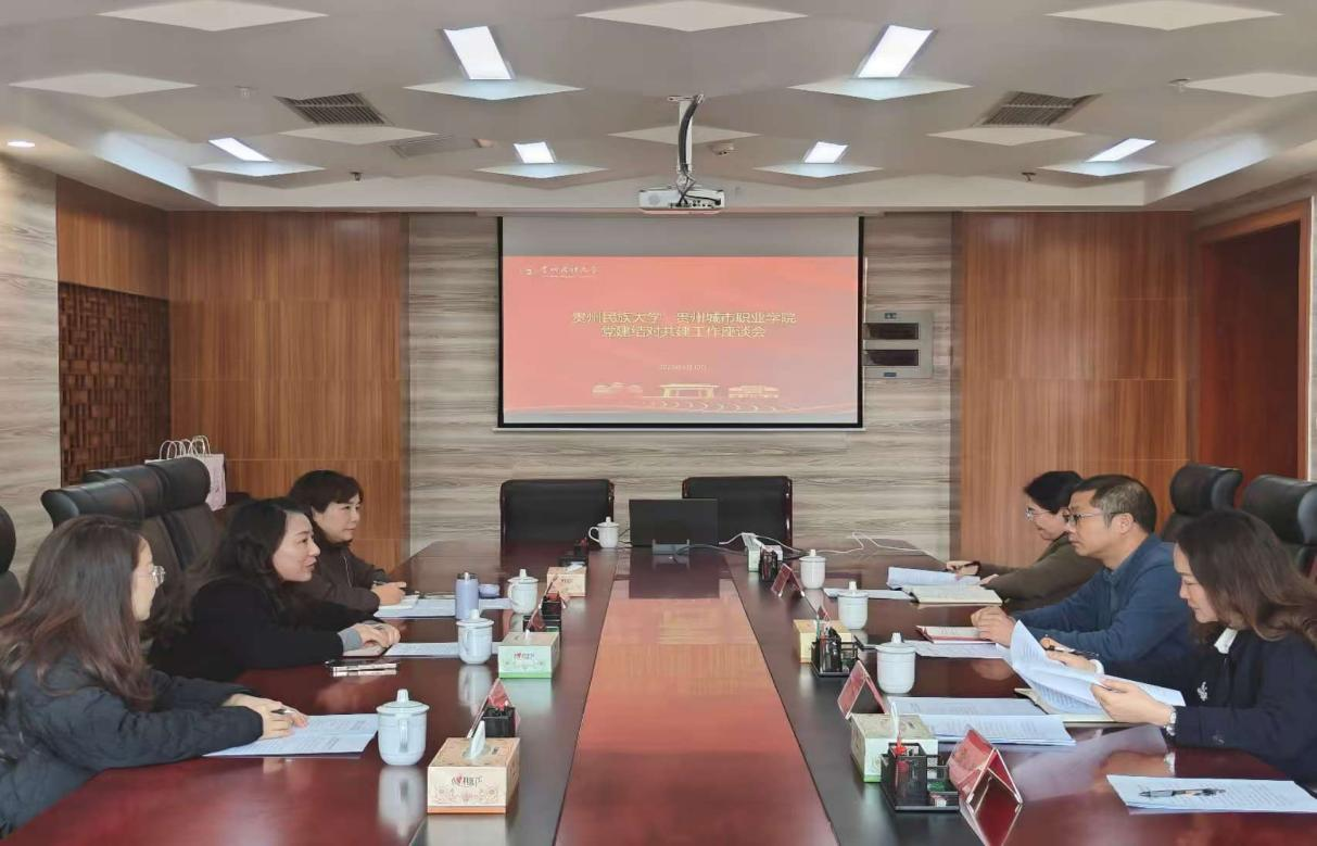 2026年3月10日下午,贵州城市职业学院党委副书记赵磊、党委组织部部长赵海燕、副部长王莉鑫一行赴我校开展交流座谈,双方聚焦党建引领教育教学、学科建设、干部培训、对外交流等重点领域进行交流研讨,共商两校党建结对共建事宜。贵州民族大学党委副书记蒋雪明出席会议,党委常委、组织部部长陈懿,组织部副部长蒋桂东和有关工作人员参会。